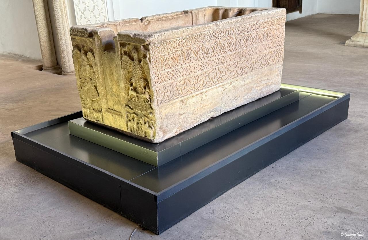Although it was discovered in the Ibn Yusuf Madrasa in Marrakesh, which belongs to the Sa’did period (10th / 16th century), the name of the patron and the comparative study with the al-Mansur basin in the National Archaeological Museum in Madrid suggest that it was originally from Madinat al-Zahira (English: “The resplendent city”) in Córdoba (Spain).