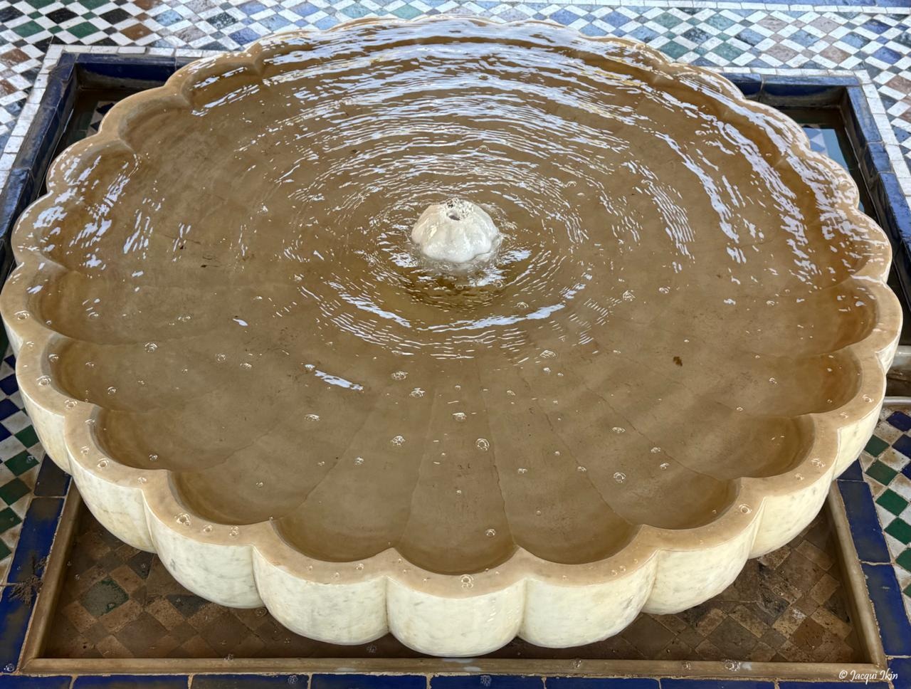 The 11th-century “marble ablutions basin” from the Ben Youssef Madrasa is a masterpiece of Andalusian art originally created in Córdoba for ‘Abd al-Malik, the son of vizier Al-Mansur. Brought to Marrakech in the 12th century, this imported piece is heavily decorated with floral motifs, including acanthus leaves, palms, and animal representations.
