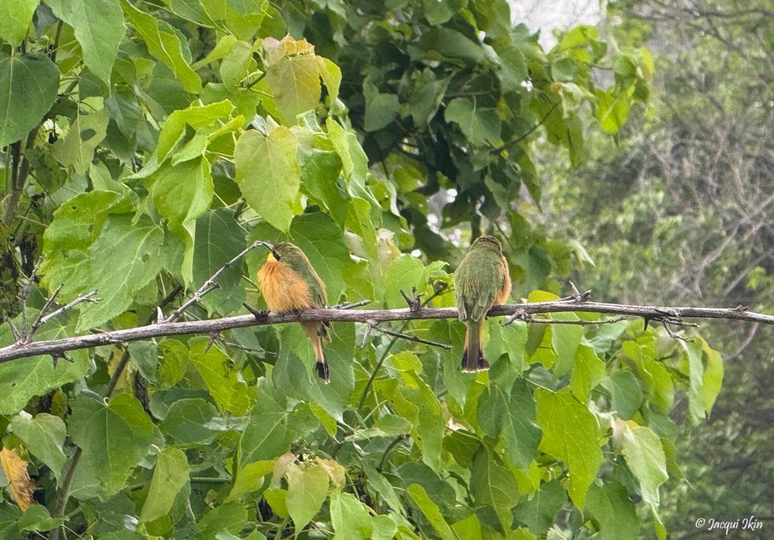 Little Bee-Eaters camouflaged against the bush.