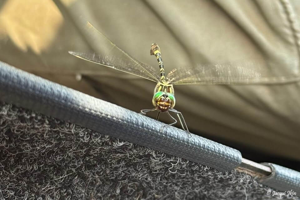 A beautiful dragonfly, hitching a ride on our game drive vehicle.